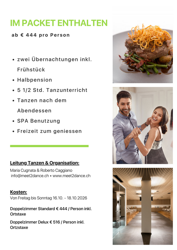 Infos zum Tanzweekend 2026 Anmeldeschluss - 22. August 2026 Bitte bei der Anmeldung unter Bemerkungen, die Einteilung sowie Zimmerkategorie vermerken! Anmeldung Tanzweekend